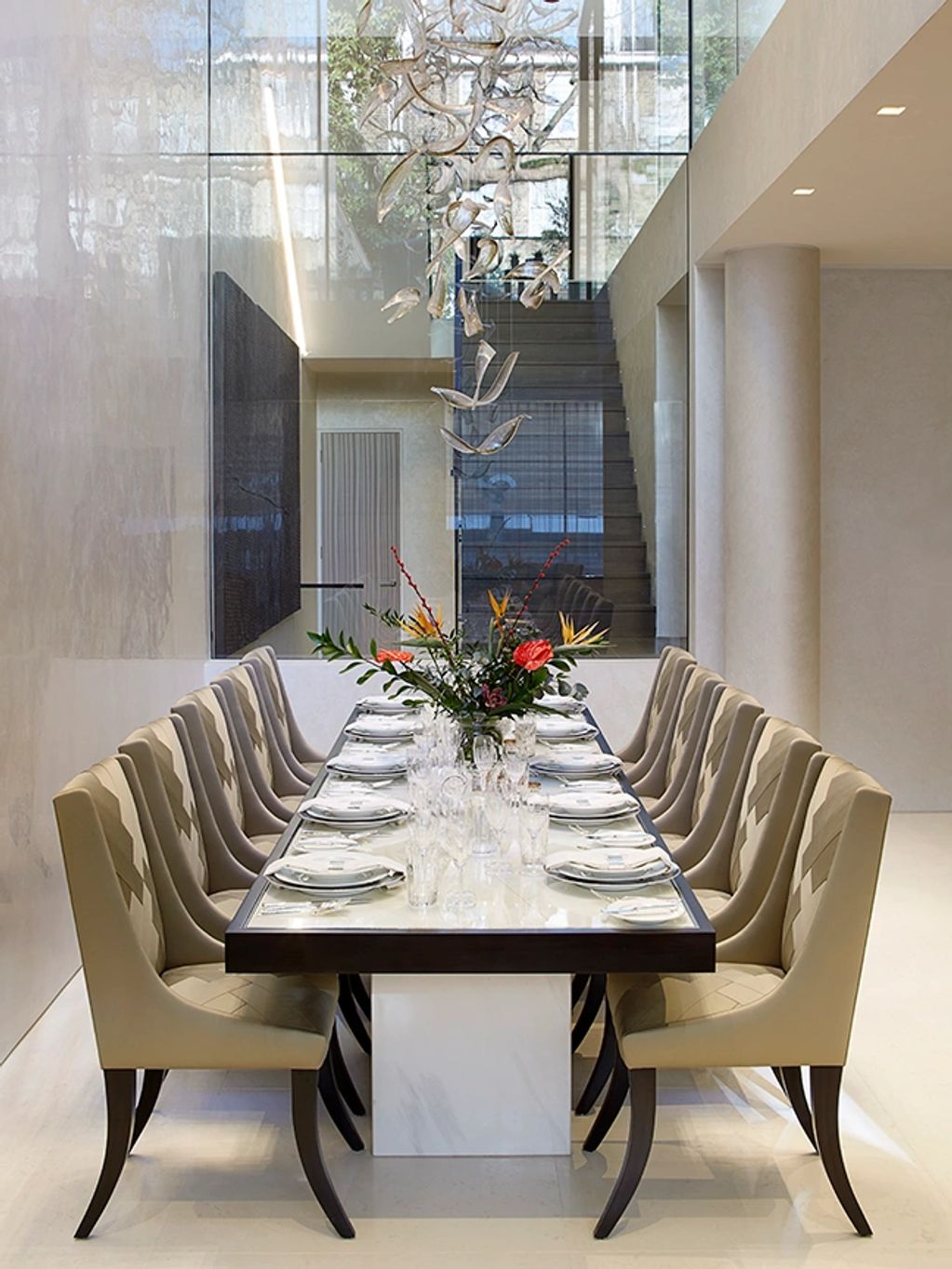 Mirror Finish Stucco Walls Reflect Both The Natural Light As Well As The Bespoke Chandelier Central To The Dining Area. Damasco Silk Columns Add Softness To The Setting